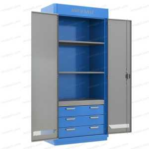 Внутреннее пространство шкафа поделено на несколько отделений полками и выдвижными ящиками; навесные двери с установленной...